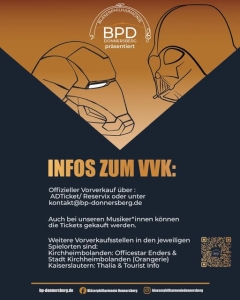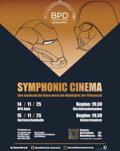 Alle Fotos: MKD/BPD![]() Aus Anlaß des 10-jährigen Jubiläums und der gleichzeitigen Umbenennung des Sinfonischen Blasorchester Donnersberg (SBO) in Bläserphilharmonie Donnersberg (BPD) Jubiläumskonzert "Symphonic Cinema" Leitung: Thomas Zell ![]() ![]() Fr. 14. November 2025; 19:30 Uhr Aula des Nordpfalzgymnasiums Kirchheimbolanden (NPG) Dr.-Heinrich-von-Brunck-Straße 47a 67292 Kirchheimbolanden Sa. 15. November 2025; 19:30 Uhr Veranstaltungshalle der Gartenschau Kaiserslautern Lauterstraße 51 67659 Kaiserslautern So. 11. Jannuar 2026; 17:00 Uhr Donnersberghalle Obermühle 1 67806 Rockenhausen Die Bläserphilharmonie Donnersberg präsentiert "Symphonic Cinema", ein Konzert gespickt mit Highlights aus der Filmmusik. Lassen Sie sich entführen in die Welten von Luke Skywalker und Darth Vader zu den Klängen von John Williams, in die Zeit der französischen Revolution mit Les Misérables, kämpfen Sie mit Jack Sparrow in Fluch der Karibik oder tanzen Sie mit Bellé bei Die schöne und das Biest. Ob John Williams oder Hans Zimmer, für jeden Geschmack ist etwas dabei. Die BPD unter der Leitung von Thomas Zell hat sich mit ihren über 50 Musiker*innen ein halbes Jahr vorbereitet um Ihnen ein besonderes Konzerthighlight zu bieten. Verpassen Sie also nicht "Symphonic Cinema" von und mit der Bläserphilharmonie Donnersberg und Leitung von Thomas Zell. Offizieller Kartenvorverkauf: ADTicket / Reservix oder unter kontakt@bp-donnersberg.de oder direkt bei unseren BPD-Musikern. Weitere Vorverkaufsstellen in den jeweiligen Spielorten sind: Kibo: Officestar Enders & Stadt Kirchheimbolanden (Orangerie) Kaiserslautern: Thalia & Tourist Info Weitere Infos siehe: bp-donnersberg.de Alle Fotos: MKD |